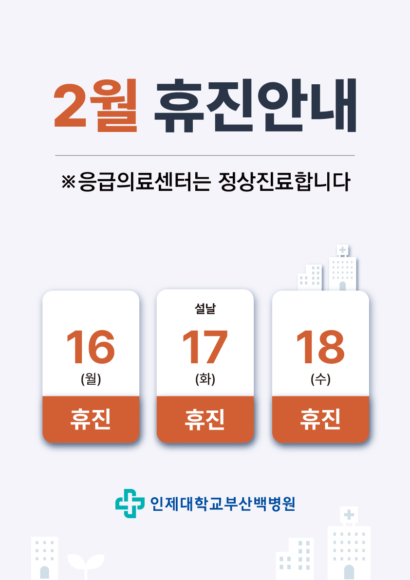 부산백병원 [2월 휴진안내] 설 연휴 2/16(월)~18(수) 2026-02-10 594 설날 연휴 2/16(월) ~ 2/18(수) 휴진입니다. 응급의료센터는 정상 진료합니다. 병원 이용에 참고해 주시기 바랍니다.