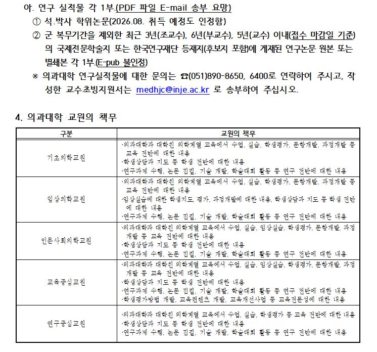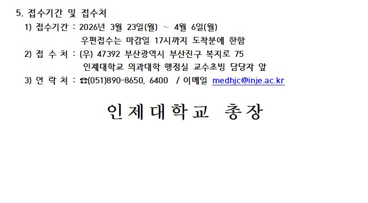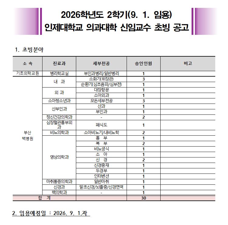 1760. [부산백병원] 2026학년도 2학기(9. 1. 임용) 인제대학교 의과대학 신임교수 초빙 공고